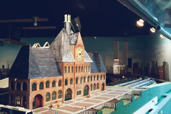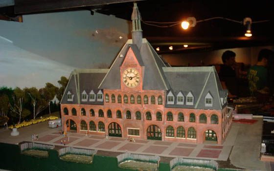 Pete is almost finished with this incredible structure. In the distance can be seen passenger trains coming out from beneath the station. Also, note the World Trade Center towers, which we will leave in place in memory of September 11, 2001.